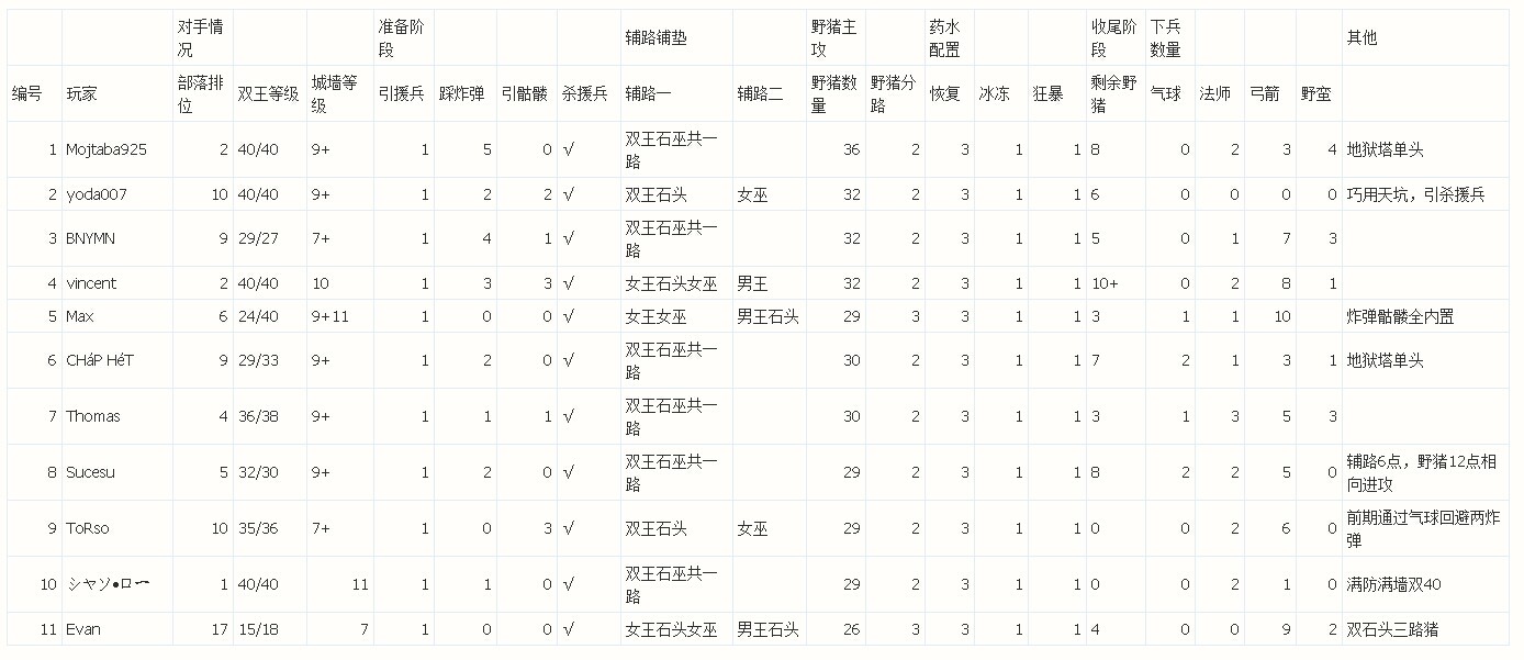 引子:最近一个月我在为一个十本部落录制部落战十本三星视频。旁观部落战失败胜利平局都有过,尤其是最近连续三场部落战打得有喜悦也有惊险,能够在现场直播里目睹十本好手越来越精彩的对战技艺是我的荣幸。尽管版本更新一次又一次,不断削弱着野猪这个曾经的主流部队,部落里一位野猪流玩家几乎每次部落战都有三星的成绩,让我对这个日渐弱势兵种的玩家产生了好奇,也就此产生了采访的想法。