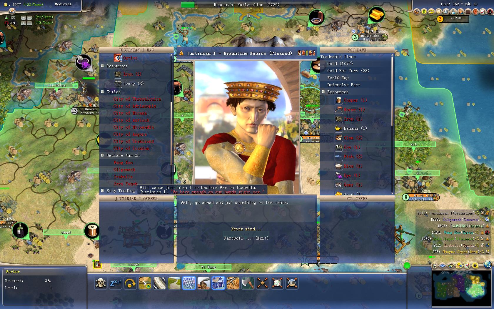 下回合准备切成强监+民族,开启间谍+爆兵双重模式