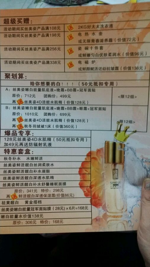 【丝美姿】活动开始了,丝美姿给你想要的白,29元=204元超级优惠,顾客在活动前期交29元,即可拿到丝美姿价值28元嫩白能量冠军面膜贴一片,预售卡一张及价值100元丝美姿代金券,顾客在活动期间,可凭预售卡免费领取丝美姿价值76元无限青春滋养乳一瓶!,活动期间,买丝美姿产品满108元,送2kg好