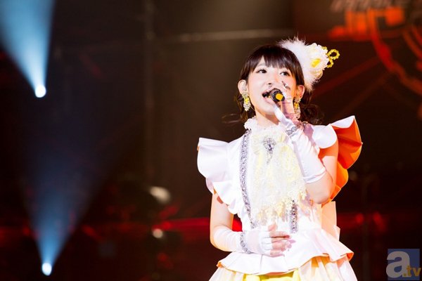 然后、第16首「fortissimo -from insanity affection-」、她向大家展示了一件黄白两色的可爱服装。同时还戴著一个像是王冠的头饰、穿著过膝高筒袜、全方位都是很可爱的形象。因为平时的「fripSide」给人感觉就是“帅气”、她现在这身服装与这种传统印象略有反差,南条桑还担心「这身服装会不会太可爱过头了?」、然而、粉丝们表现得非常愉悦的样子。