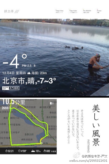 什刹海游了100米,气温零下4度,水温0度,上来赤膊慢跑了10公里,4.59的配速,用时52分钟,刚入水时全身刺痛,像上万支钢针在刺痛着全身,接着呼吸急促,过一段时间,开始感觉心脏跳动得更有力。