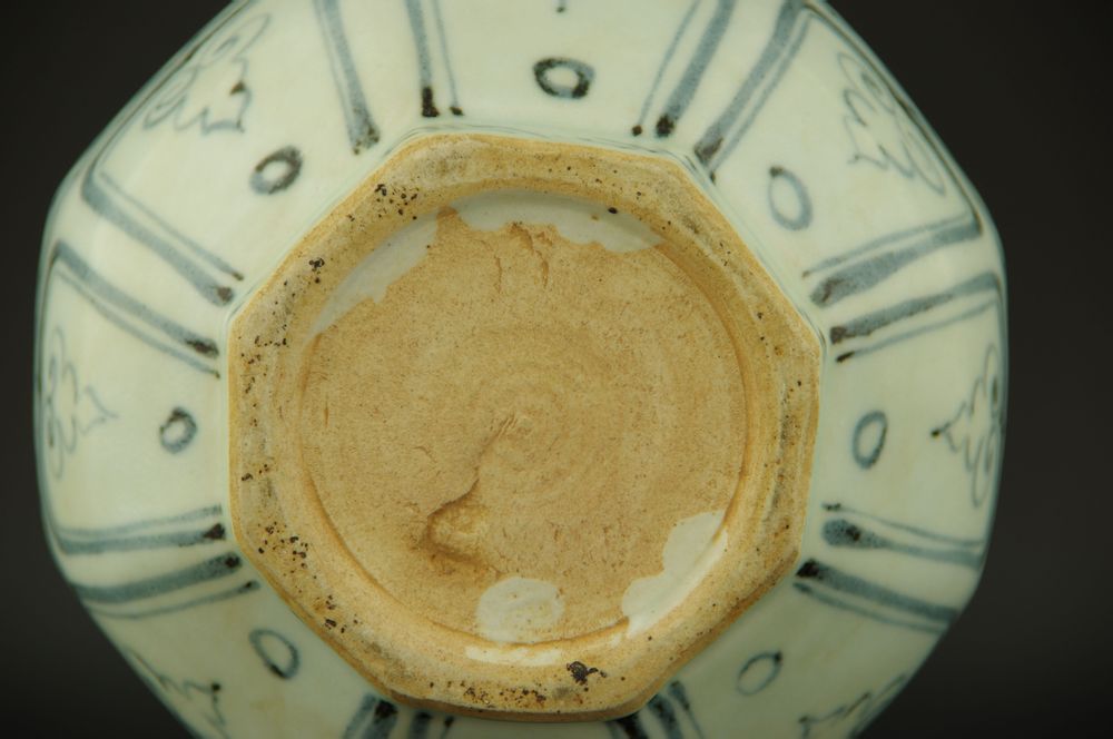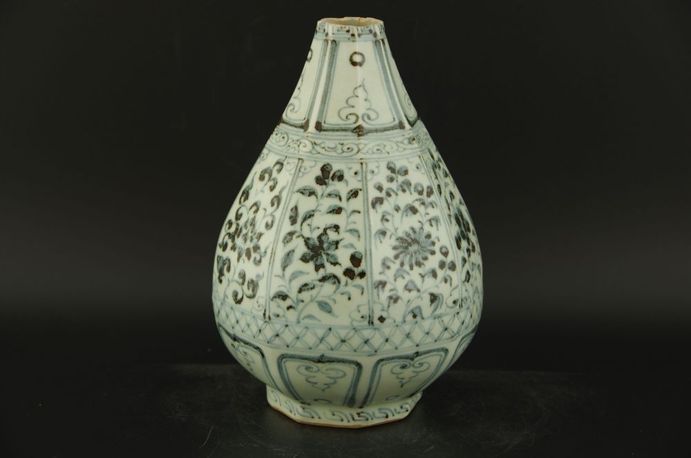 此器为八棱玉壶春瓶(残器),残器部分能见7层纹饰,釉面较薄有油润感,青花发色呈蓝灰色有晕散,浓艳处呈黑褐色锈斑下凹,画工自然流畅。