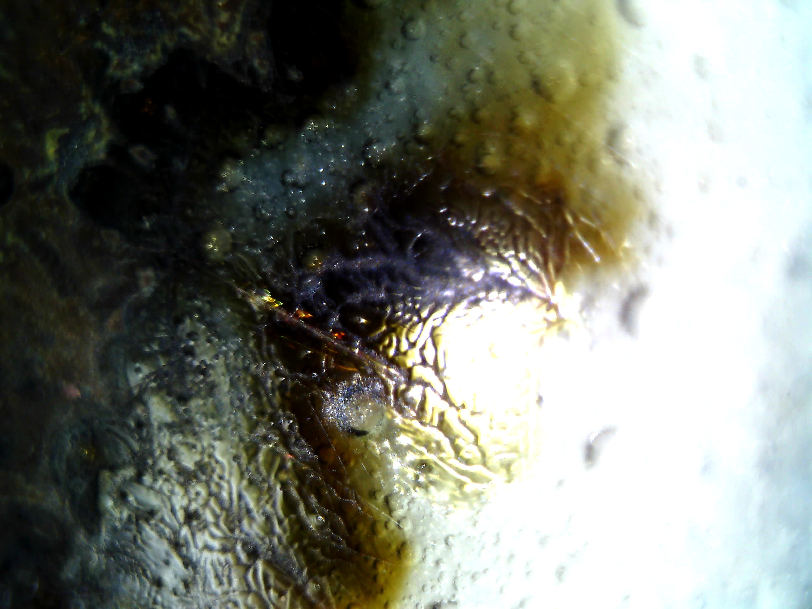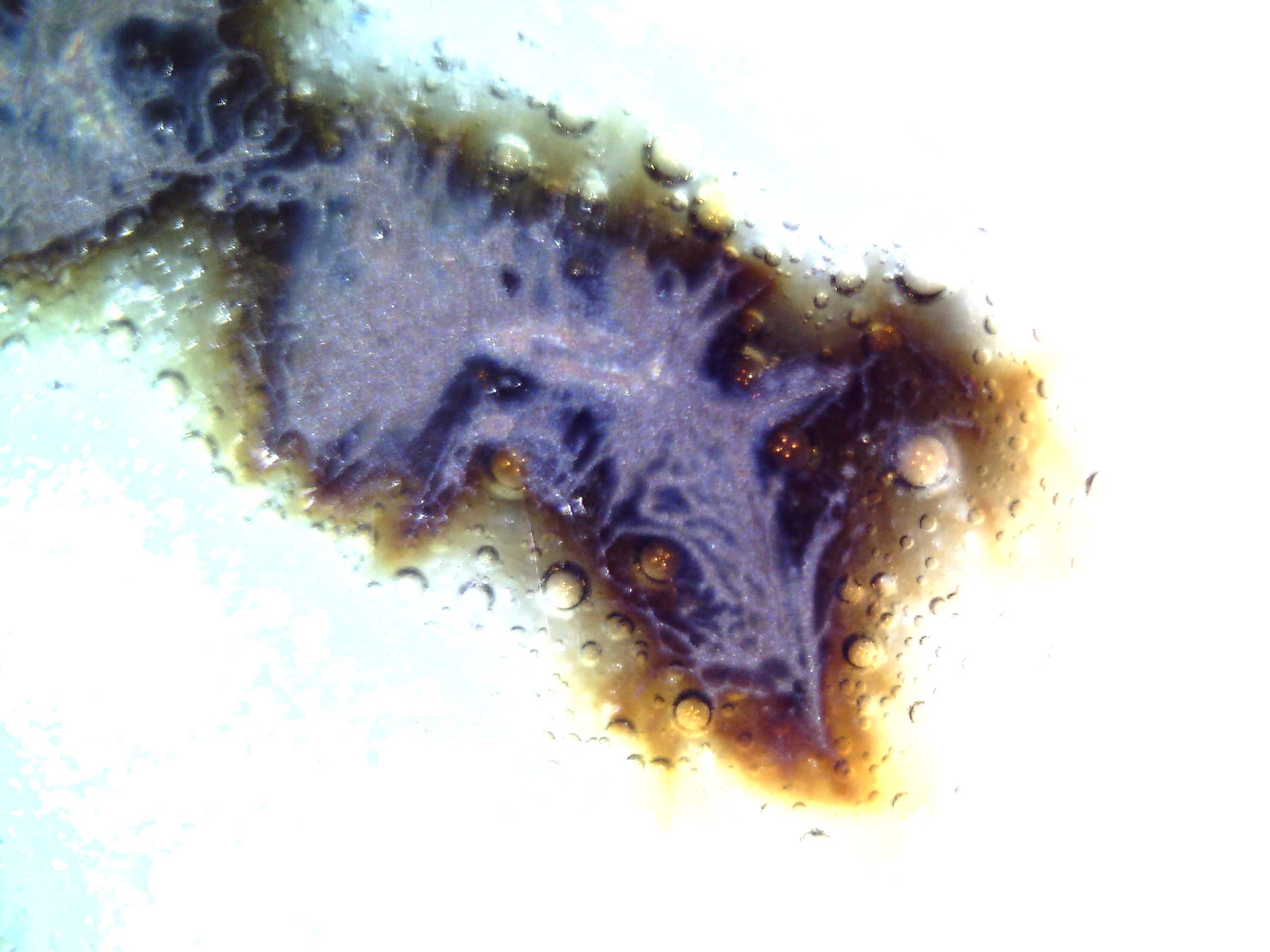铁锈斑在外观下虽然非常浓艳,在二维微观下仍可见清晰的流淌痕迹,三维微观下流淌纹路有深度且清晰,本人估计该器所用苏料研磨较为精细。铁锈斑流淌痕迹自然,有过度,且有明显的变色泡存在。