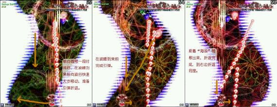固定,就可以产生出固定的回避路线。下图为E难度下自机相对boss偏左、正中、极右情况的弹幕对比图。