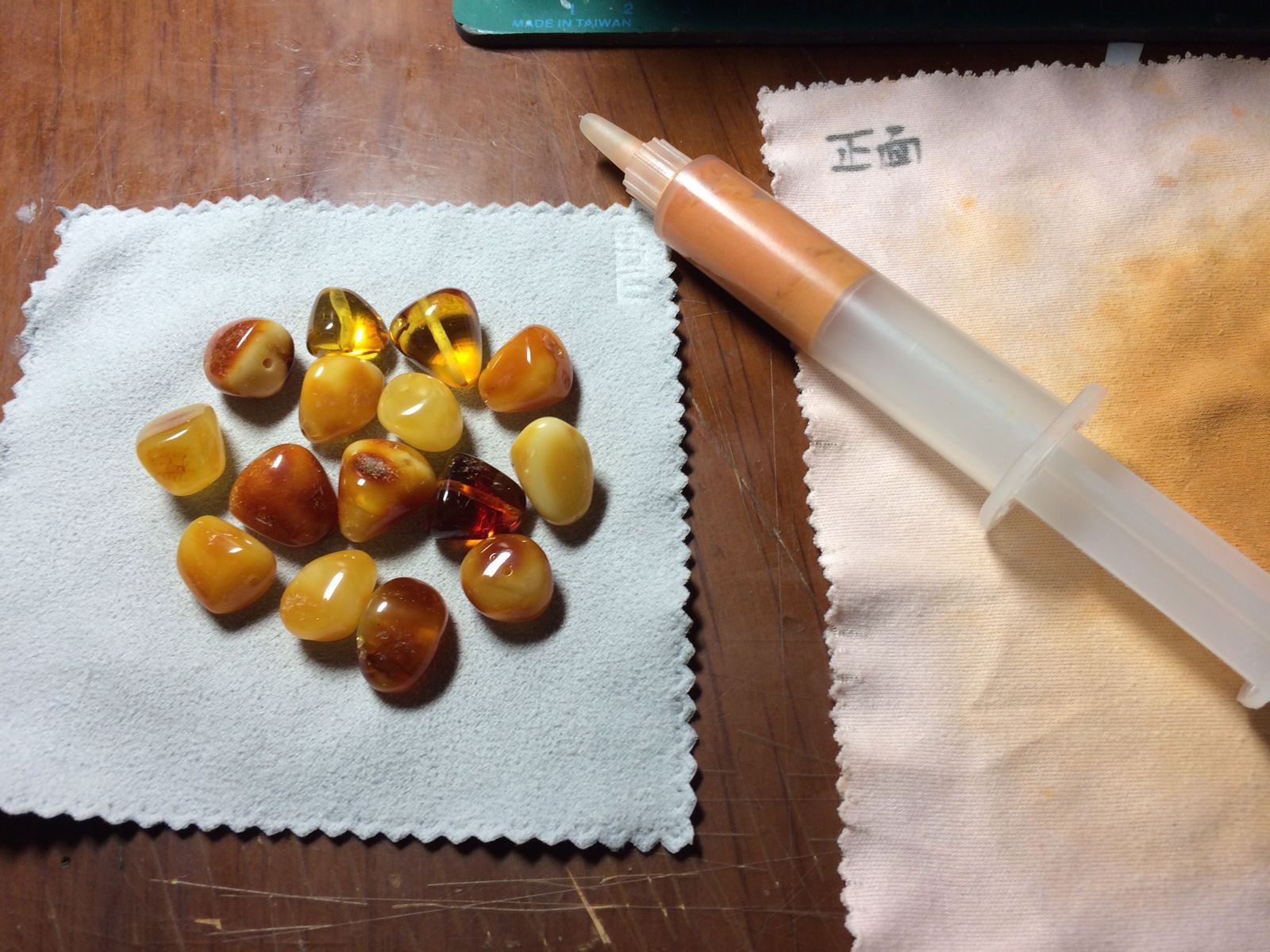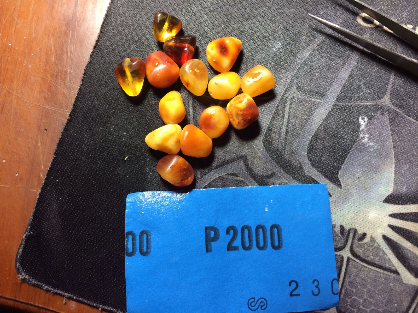 丹麦料子,14颗(11号有裂,后来被我去掉了,)~有蜜有珀,克数:13.15474克,因随型而制,表面并未完全去除坑洼,但并不影响美观,整体12000目抛光,楼下会附上全制作过程~求大神帮忙估价,克价多少~