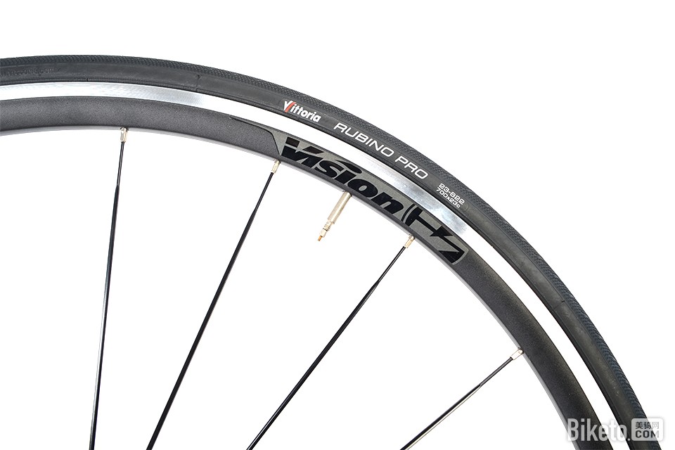 原厂轮组使用的是Vision Team 25铝合金轮组,前轮20根破风辐条直拉编法,后轮 24根破风辐条,非驱动侧直拉-驱动侧3X编法,车圈高度为25mm,宽度达到22.5mm,是目前宽度较大的铝合金轮组。