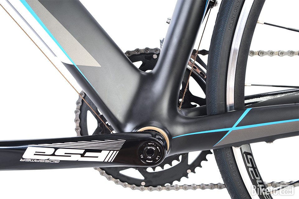传动套件采用了刚升级为11速的5800变速套件混搭FSA Gossamer一体牙盘,牙盘齿数为50—34T,链条为SHIMANO HG-X11。整套传动系统变速方面显得轻柔,顺畅,操作手感也是一贯的SHIMANO风格。虽然是SHIMANO入门竞赛级别不过整体性能已经足够大多数车友使用。关于5800套件更详细的信息请参考过往BIKETO评测室的测试:《蜕变!SHIMANO 5800公路套件评测》。
