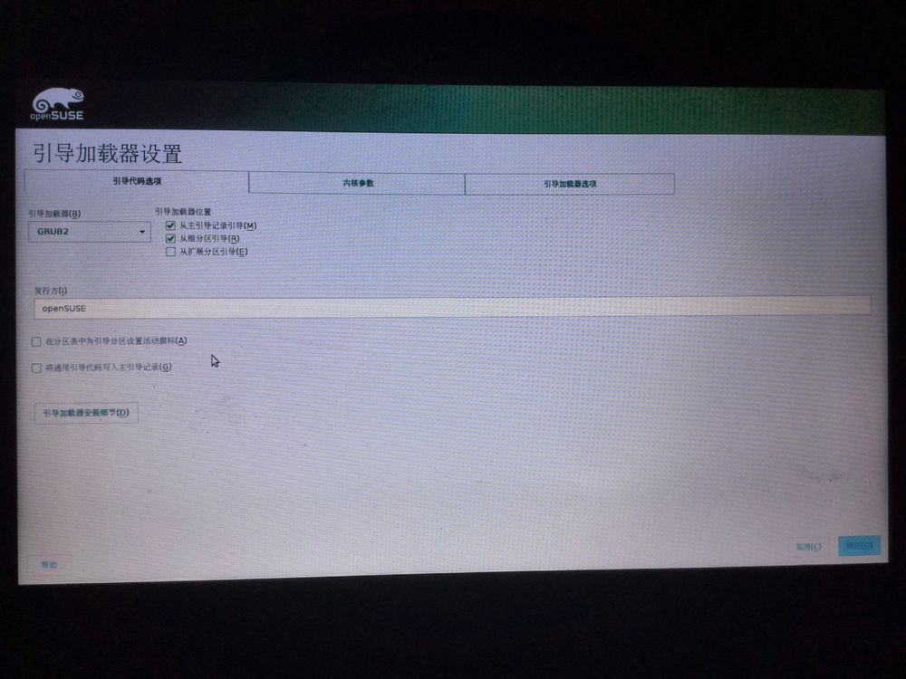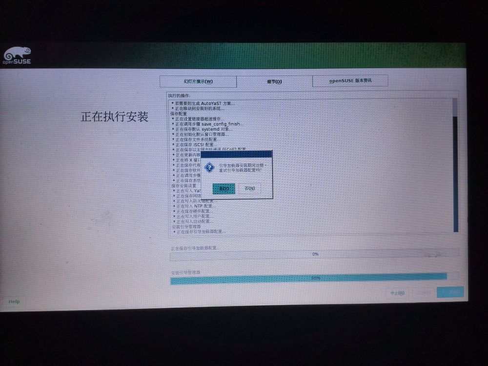 我是win7下U盘安装。先用软碟通烧openSUSE-13.2-DVD-i586.iso到U盘,然后从U盘启动。然后看到了一系列好看的设置步骤。一切都很好,直到安装进行到96%的位置提示我: