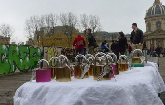 于是,秉着保护古建筑的原则,巴黎市政府做了一个让情侣们悲痛欲绝的决定:将艺术桥上的锁全部移除,全面禁止秀恩爱的再往桥上挂锁!
