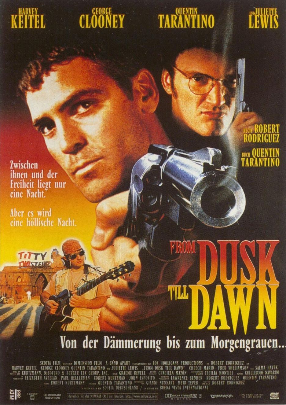 昆汀·塔伦蒂诺编剧+主演配上罗伯特·罗德里格兹导演,还能更暴力更无厘头吗?该片硬是把警匪公路片和B级僵尸片混搭到一块儿,昆汀典型的话唠+恋足癖、克鲁尼配上萨尔玛海耶克的性感蛇舞,一定能吸引你的眼球。各种血腥色情黑色幽默(安全套装圣水和sex machine简直太囧)少不了,结尾那个镜头更是点睛之笔。(8.0/10)