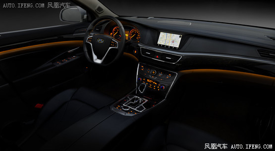 内饰方面,吉利GC9内饰以纯黑色为主,满足其偏运动时尚车型的定位。从中控台看开去,在中控以及方向盘部分大量采用了镀铬装饰并辅以橙色的氛围灯,仪表盘采用全彩3D立体表盘组合仪表,主表盘类似AudiA8的设计风格,更烘托了车内时尚运动的气息。此外,其仪表盘中部还运用液晶显示屏。
