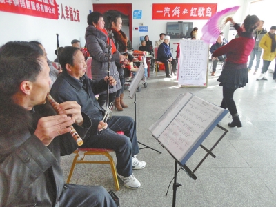 本报周口讯“一送(里格)红军,(介支个)下了山……”4日上午,当周口市民间红歌会的队员们唱起这首歌时,居住在周口康乐养老院的张明德老人,激动地流下了热泪。作为经历过抗战和解放战争的“老兵”,一首首红歌勾起了他的回忆。当天,20多名红歌会会员来到张明德所居的养老院,为这里的近30名老人演绎了令人回味的“红歌”(如图)。当日上午9时许,大河报记者在周口市区太昊路与西环路交叉口的康乐养老院内看到,近30名老人精神抖擞地坐在台下,20多位红歌会的队员们轮番上阵,为老人们演绎了一首首激人奋进、令人回味的红歌。每当唱到动情处,总有老人禁不住两眼泛红,跟着节拍轻轻打着手势。