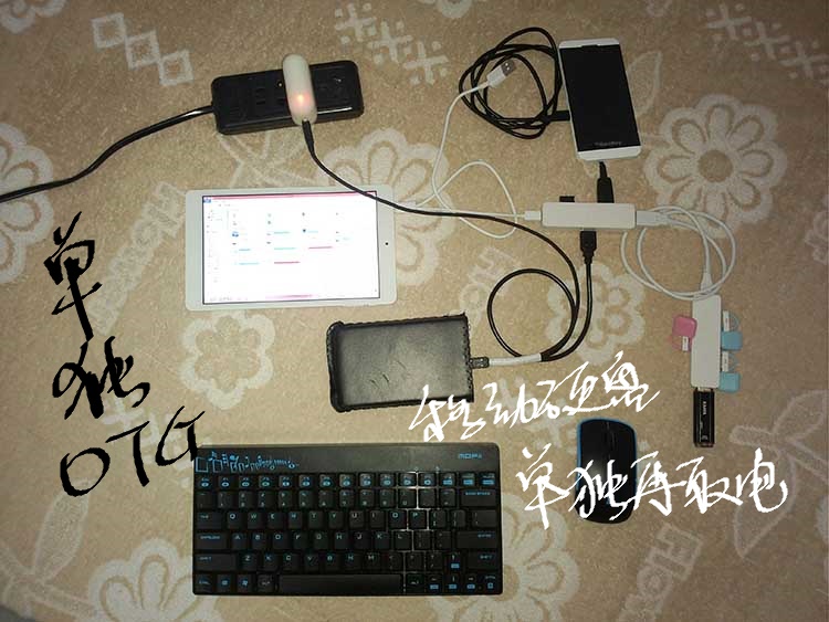 1、初次使用,可在平板不重启的情况下使用单独OTG功能。另外,从边充电边OTG切换到单独OTG可直接按此接法连接。接法如下图所示: