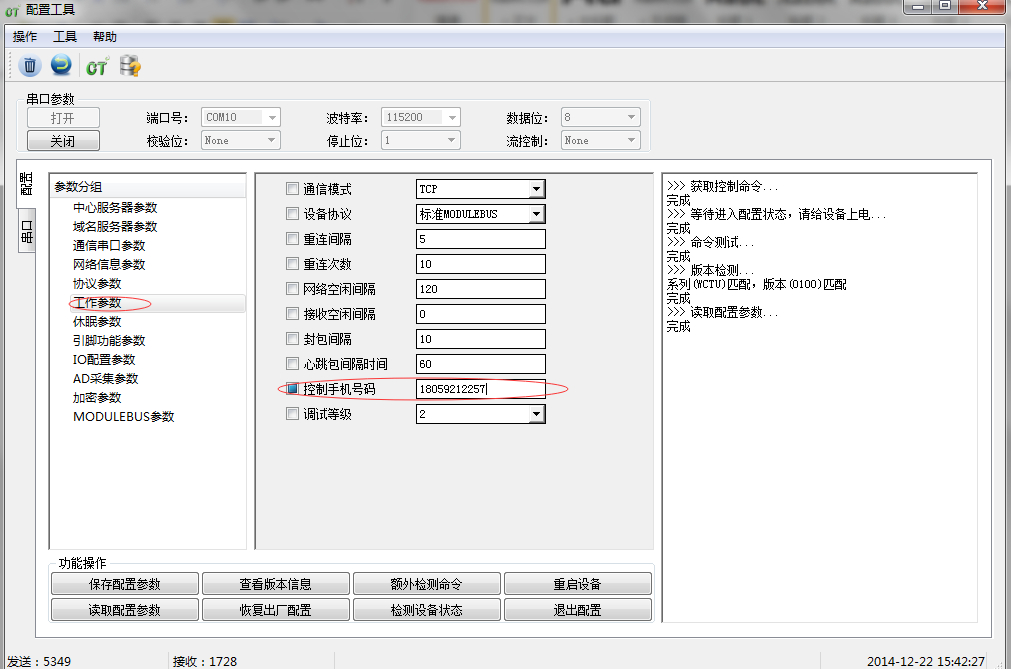 4,短信控制配置,先配置控制手机号码,在设置引脚功能参数和I/O配置参数: