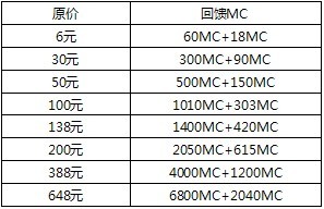 2.参与MC额外赠送30%的活动时,点击游戏内充值金额后,跳转的充值部分支付页面可能存在显示充值MC为原数量,请在充值成功后登出游戏,再次进入游戏内确认,额外赠送的MC将在成功充值后直接到账;