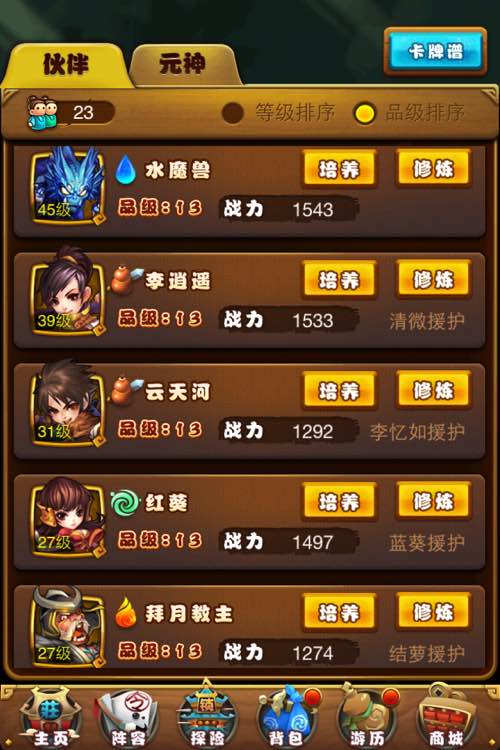 汗,你的好多卡片我都没有,进游戏一个一个看技能和缘分了,所以回复比较慢:紫英(逍遥)红葵(沈期霜)王蓬絮(花楹)厉岩(镇狱明王)结萝(韩菱纱)等有了姜承就替换掉镇狱明王,枯木替换韩菱纱,另外个人认为王蓬絮也可以换掉,毕竟在你的队伍里面除了花楹就没有缘分了 ————纯属个人意见,不