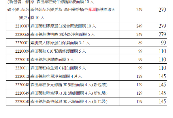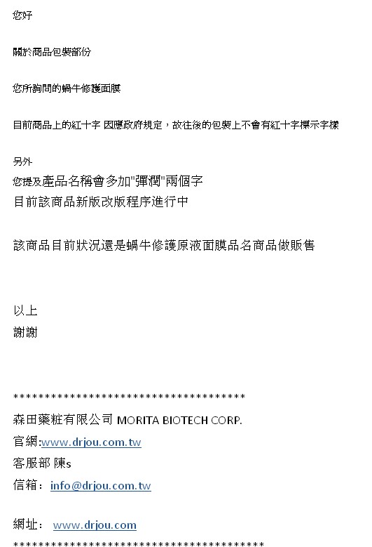 其中对于蜗牛修护原液面膜之前发公函说新版会改为蜗牛弹润修护原液面膜,但是目前进到 的货名字没有改变,针对此事询问森田厂家,回复是目前依然使用原来的名字贩售。名字便成为 蜗牛弹润修护原液面膜的版本估计以后才会有的把。
