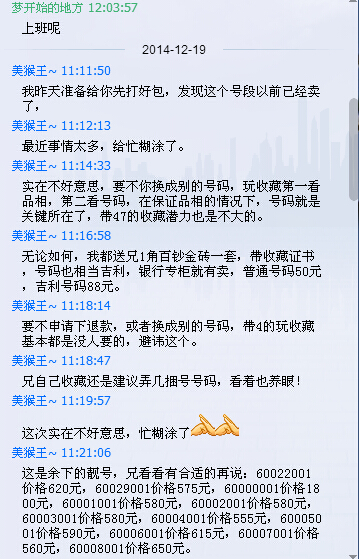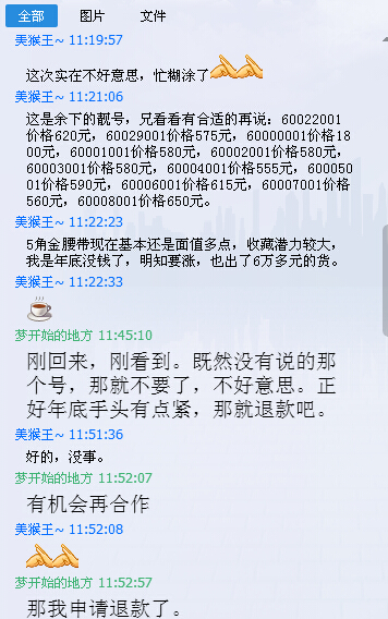 12月16日拍了"美猴王"的8005一包,5300元。12月19日"美猴王"说货卖给了别人,问我买不买其它的号好价高些的货,我说不买了,然后退款了。"美猴王"也知道自己不对,答应送我一件小礼品,价值50元的百钞金砖一件。我看他态度不错,还说他信誉好,也在贴吧里说了他信誉好。