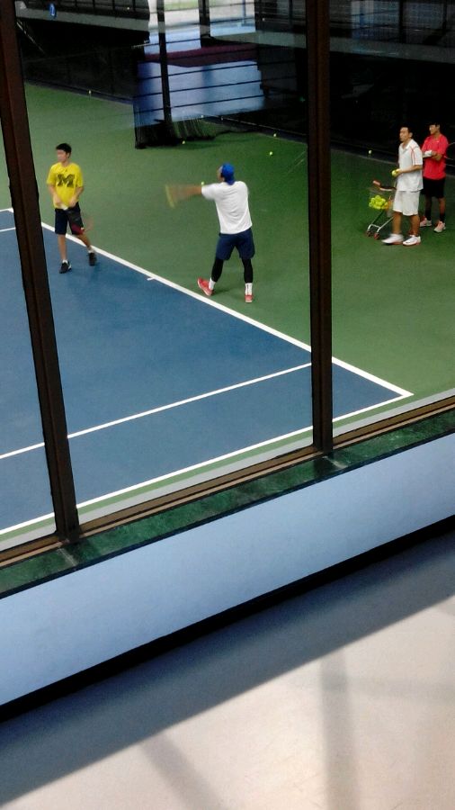 旁边是少体校小队员在学习经验。南京体院有30多块网球场,草地,澳网场地,美网场地。室内8块场地,全部暖气,不是挤在一起学,而是在一起像张择学习。