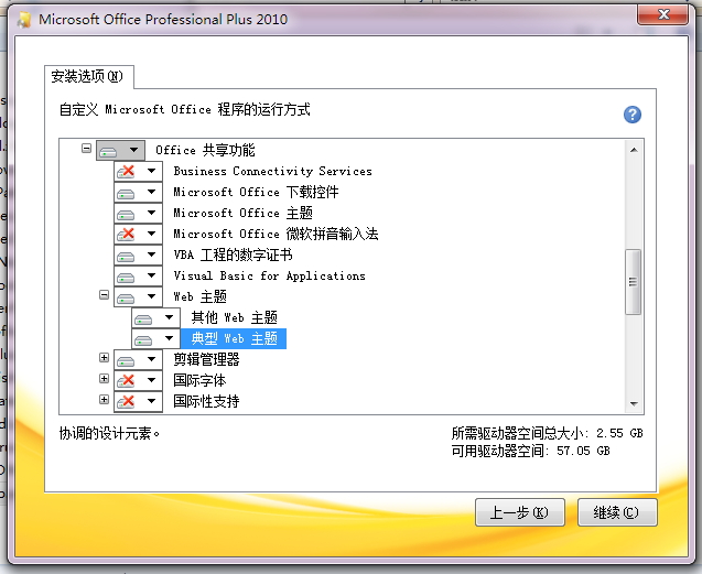 2、在安装选项中选择“Office共享功能”中的“Web主题”-->从本机运行,如下