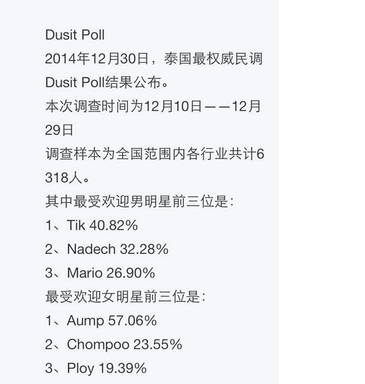 Suan Dusit Poll调查“2014年度之最”结果公布,娱乐部分:年度男明星 - Tik,二三名为Nadech和Mario;年度女明星-Aump,二三名为Chompoo和Ploy。年度男女歌手分别为Stamp和Da Endorphine;年度男女民谣歌手为Phai和Yinglee。恭喜![teenee]今天 15:38 来自 微博 weibo.com
