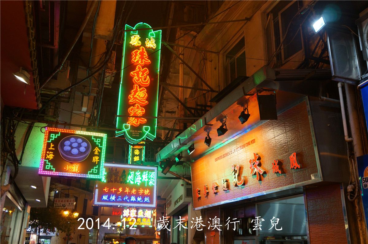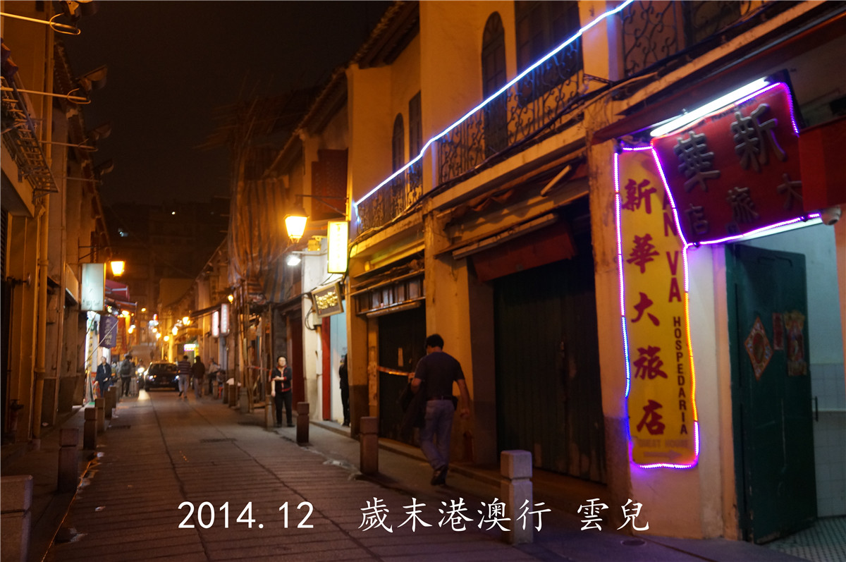 下车之后,映入眼帘的是漂亮的夜景,鸟笼款是老葡京酒店,落地开花款是新葡京酒店。按照地图的指示,往西北方向走去,晚上的光线和白天不一样,路牌啥的不易找到,稀里糊涂来到一条繁华的商业街,感觉像我要找的新马路,但是没见到对应的路牌。终于在银行的招牌中看到了新马路字样,心里踏实了。