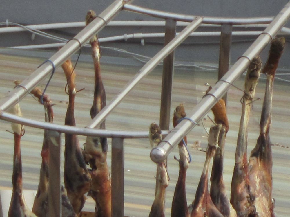不是,是一家饭店,上面挂的是腌制了的,看着心里很不是滋味,陆陆续续来吃吃饭的人都是开着比较好的车来的。哎!