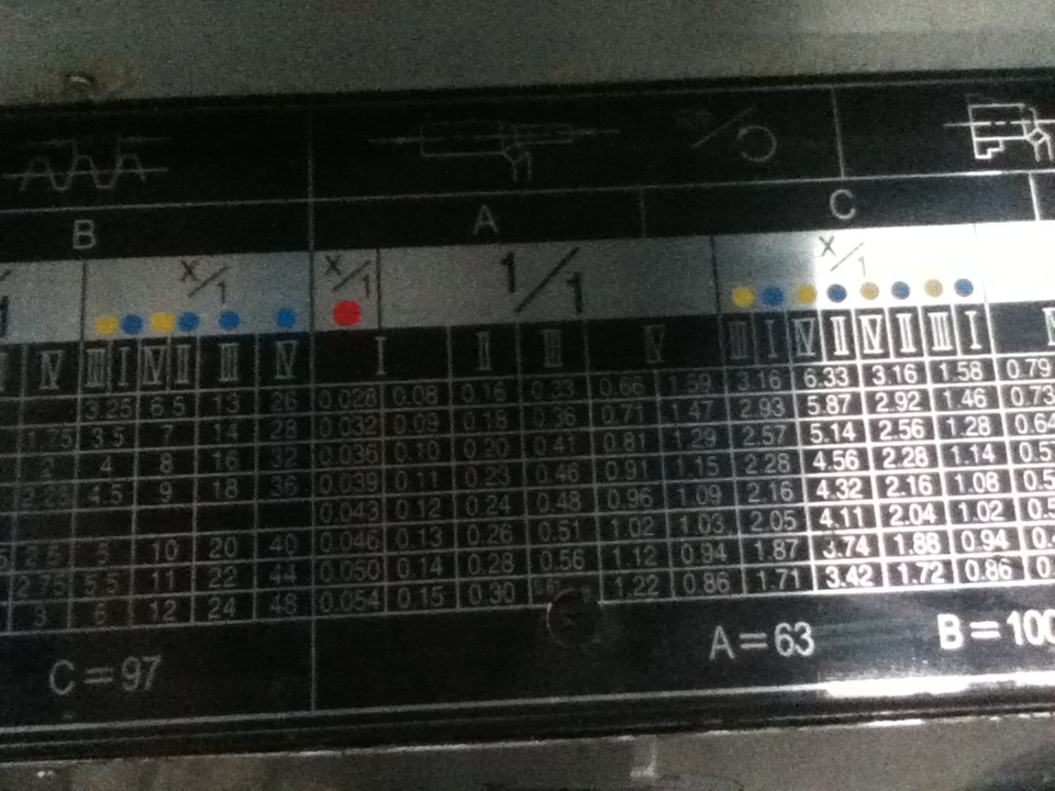 转速是上面右边的,里面大把是机床上标识的颜色,小把就是所在位置颜色的转速了。文笔不好能懂不?
