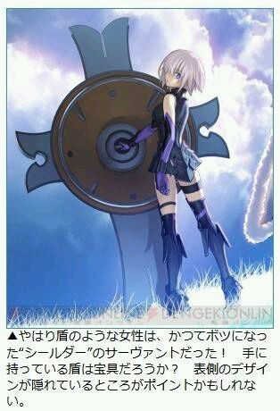 手机游戏『Fate/Grand Order』最新情报大量公开! 奈须蘑菇氏、武内崇氏访谈 http://t.cn/RhsMZuD 正式公开说明贞德是坂本真绫,公开了游戏的舞台是2015年,以及从者“shielder”这个阶职名称(“シールダー”のサーヴァント),待续