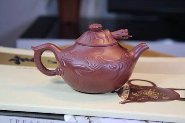 云龙壶,160CC,壶呈紫红色,壶身绘有夏日流动云彩的浮雕,并塑有两条巨龙在云间翻腾,其中一条龙钻出壶盖,龙头伸缩自如,从云端下垂出龙尾,构成完整的壶把;壶身所塑另外一条龙自云端向下气韵贯通,形象生动,此壶胎体轻盈、灵秀!