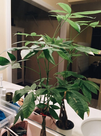 盥洗台上完全没有阳光,但也养了很久,少数叶子边缘有些黄
