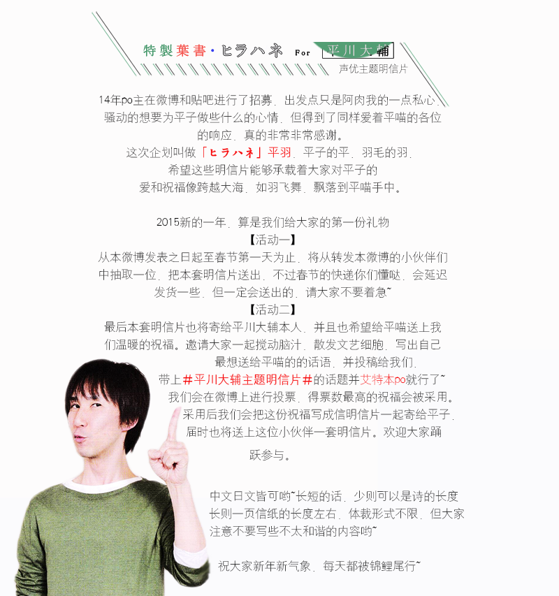 【活动一】为了抽奖集中方便抽取,想参与活动一的亲,请大家转发这个微博http://weibo.com/2213027682/BEbODcnX8?type=comment#_rnd1420513724933,不用fo,当然想随时了解新情况的也可以fo,但想抽奖只要转发就可以了~麻烦大家了【活动二】在贴吧上大家可以回复本帖,带上你想说的话,但是投票同样是在微博上进行。请大家多多关照~