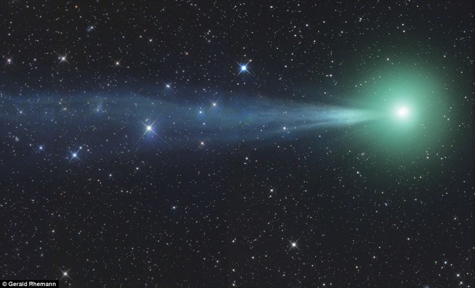 洛弗乔伊彗星目前正向北掠过地球,在身后留下明亮的绿色尾巴。