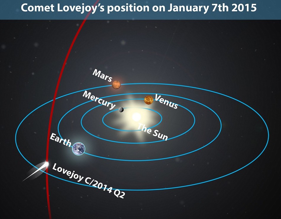 这张图片显示了洛弗乔伊彗星向北经过地球轨道的路线,1月7日它将到达距离地球最近的位置。