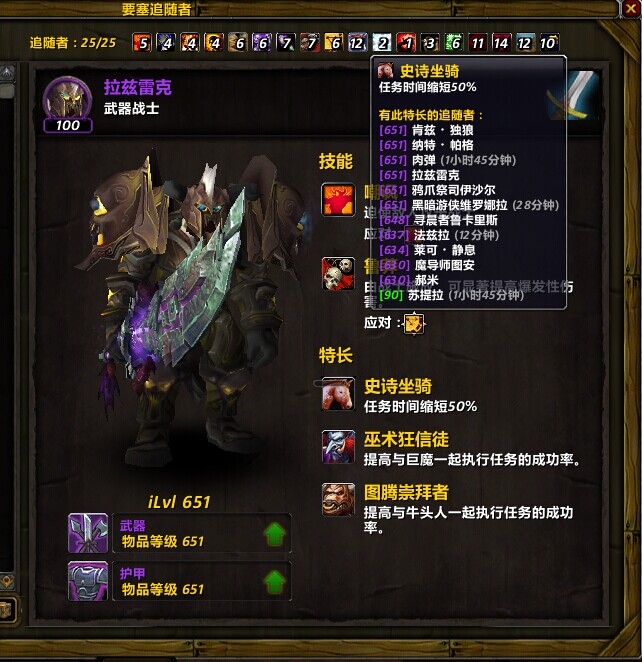 我特么吓尿了,看来楼主的在线时间很长啊,我38个随从一个史诗坐骑也没有,因为缩短任务时间也没用(每天下班玩)