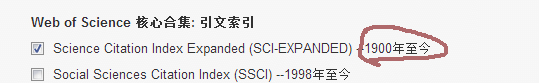如题,我在检索01年到15年这个区间里某家机构发表的论文,但我在web of science页面【更多设置】里点【Science Citation Index Expanded (SCI-EXPANDED)】时,会显示“2007年至今”,但我有朋友检索时出现的是“1900年至今”。请问这个应该怎么设置成“1900年至今”?谢谢大家。