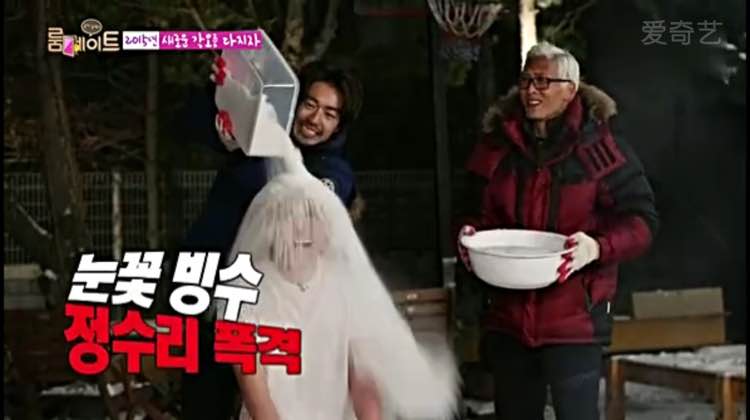 SBS实在太过份,在冰天雪地下,还要穿著如此单薄的衣服被淋冰水!东旭实在好壮健!