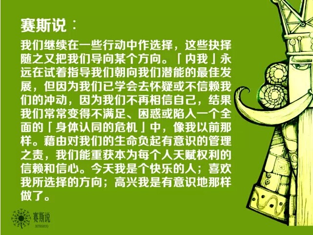 这一段说到内我帮你维持好你的身体,支持你去做自己想做的事,而如果你不信任内我,内我就会被你的信念影响,没有办法给予你充分的协助。如果要顺利接受内我的讯息,有一个方法就是——肯定你自己。