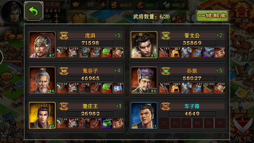 你好像少个孙子。你用全敏装。庞涓鬼谷子主防。孙膑晋文公主攻。暴击给攻。闪避给防。