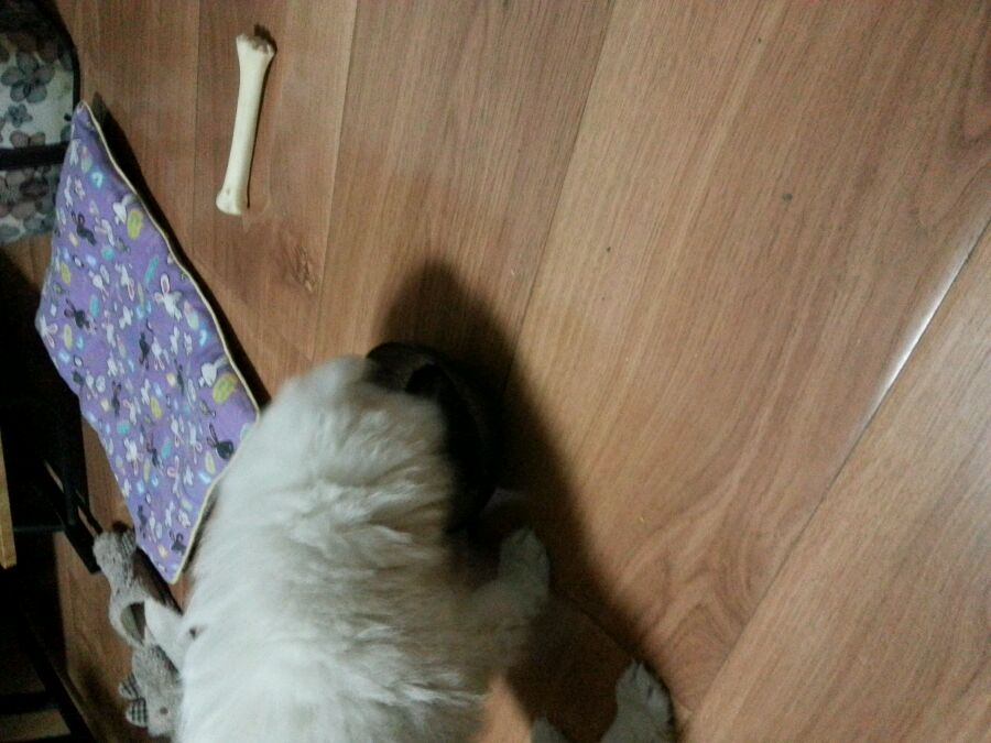沙拉碗给她放狗粮了,这是盛小菜的碗给她碾蛋黄吃了