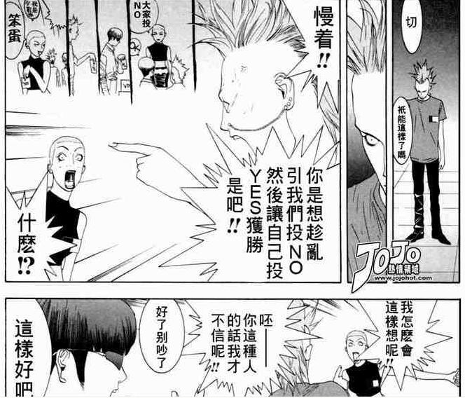 还有一点,刚想到,如果规定两个人投YES,一个投NO,也是平局,在不知道15号与秋山联盟的情况下,就不会有人担心因为有人叛变而使自己赢了的。当然如果那一个投NO的人是15号,还是秋山赢。