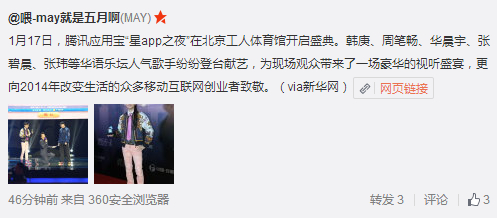 @喂-may就是五月啊:1月17日,腾讯应用宝“星app之夜”在北京工人体育馆开启盛典。韩庚、周笔畅、华晨宇、张碧晨、张玮等华语乐坛人气歌手纷纷登台献艺,为现场观众带来了一场豪华的视听盛宴,更向2014年改变生活的众多移动互联网创业者致敬。(via新华网)