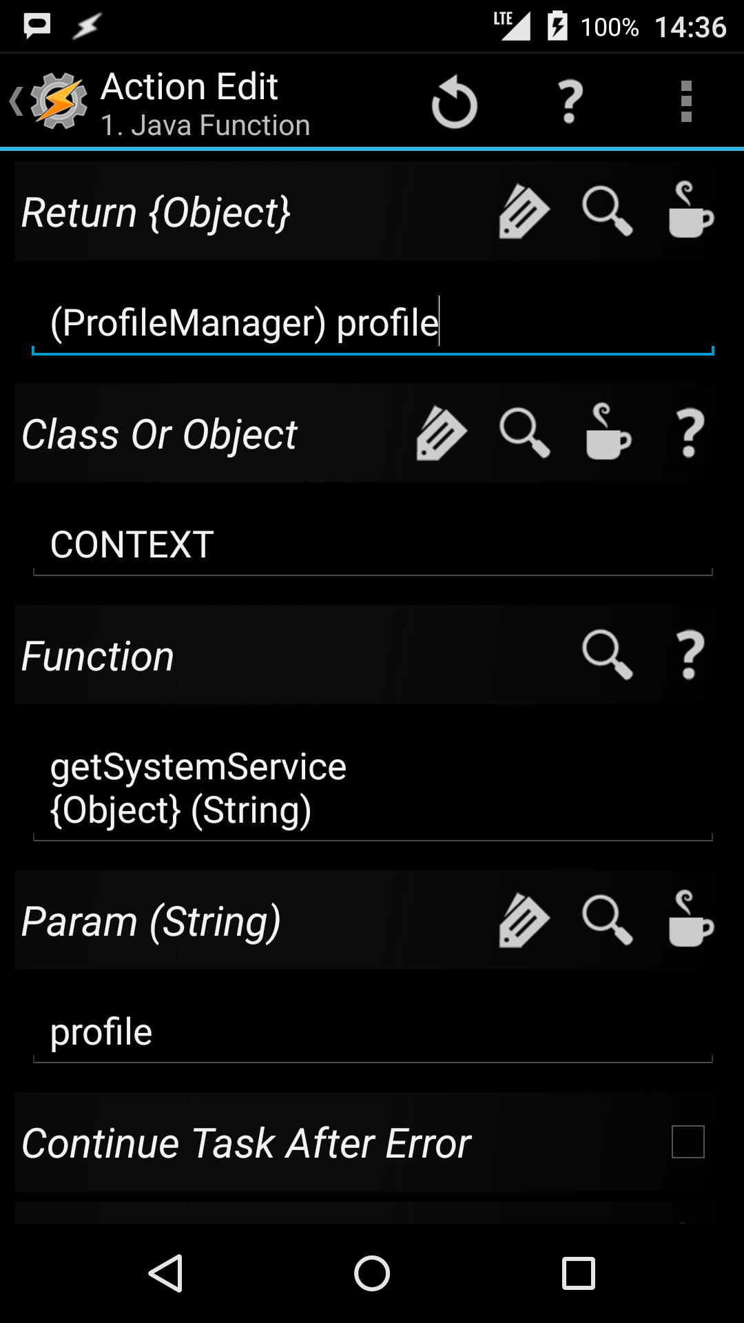 (2) 添加 - Code - Java Function ,按下图内容输入,注意Param(String)一栏输入的是情景模式的标题,如:Home、Automobile、默认…… 这里我输入%par1是为了通用性,便于设置不同模式。