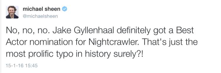 第一个提的就是老吉:为神马杰克.吉伦哈尔在《夜行者》中的表演被耍了?去年很多人为《醉乡民谣》的奥斯卡.艾萨克报不平,但和去年有11个名付其实的提名级别表演不同,今年男主这个类别没有那么挤......史蒂夫.卡瑞尔的表演与领跑的基顿和雀斑同级,但他只是主演之一。与此相比,吉伦哈尔却是一个人撑起了《夜行者》。我还没看过《万物理论》,但既然大家都说雀斑演得好,我也承认。但我认为吉伦哈尔的表演才是最好的。【全、年、最、佳。】而他竟然连提名都没捞到。