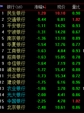 银行是倒数第一,跌得也是昨天大涨的中国银行。先抛了再捡回来吧。