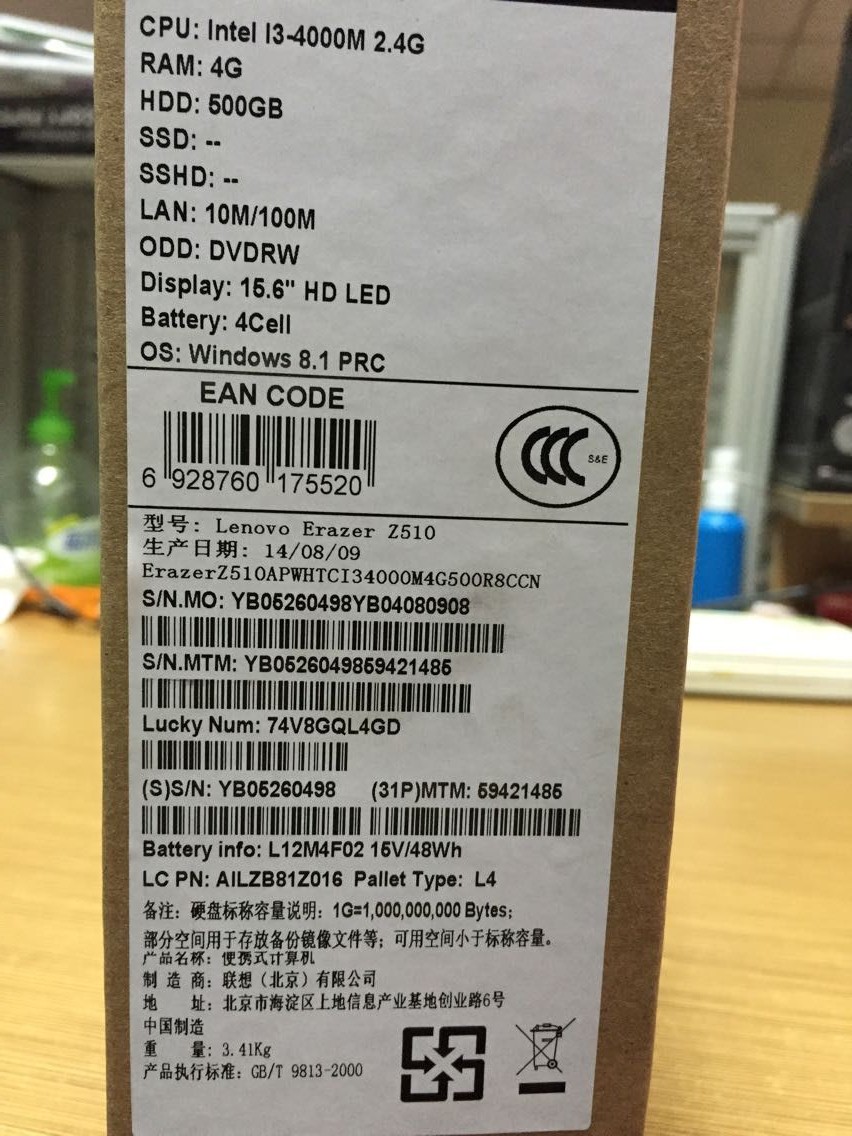 配置:Z510-ITH I3 4000M 4G 500G硬盘 GT740 2G独显 15.6寸 实际外观白色WIN8.1 生产日期2014年8月份