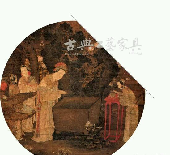 图中还出现了矮几,这样的格栅式几的造型一直沿用到清代,我们现在还可以见到不少清代苏作的格栅式小几,用以摆放文玩,但是大型的格栅式案子倒不常见了,这些年笔者只见过一件完整的格栅式案子,表面有虎皮漆装饰。