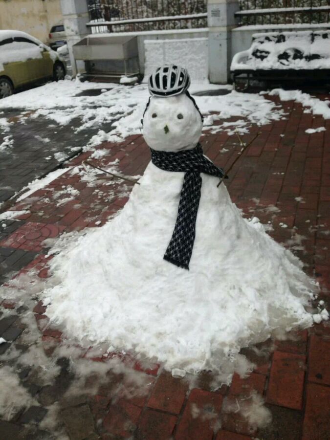 下雪了,然后本地车店堆了一个雪人