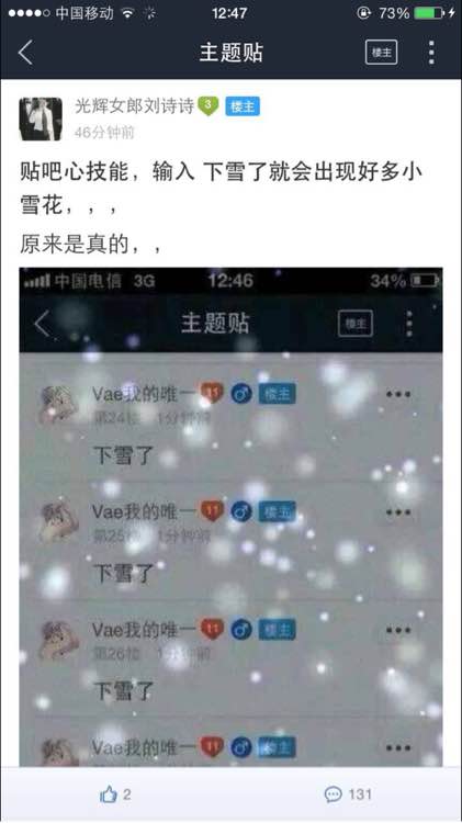 贴吧新技能 输入下雪了 就会有雪花 有图