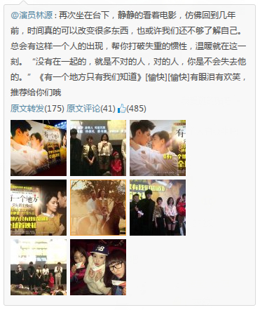 @演员林源 : 再次坐在台下,静静的看着电影,仿佛回到几年前,时间真的可以改变很多东西,也或许我们还不够了解自己。总会有这样一个人的出现,帮你打破失重的惯性,温暖就在这一刻。“没有在一起的,就是不对的人,对的人,你是不会失去他的。”《有一个地方只有我们知道》[愉快][愉快]有眼泪有欢笑,推荐给你们哦